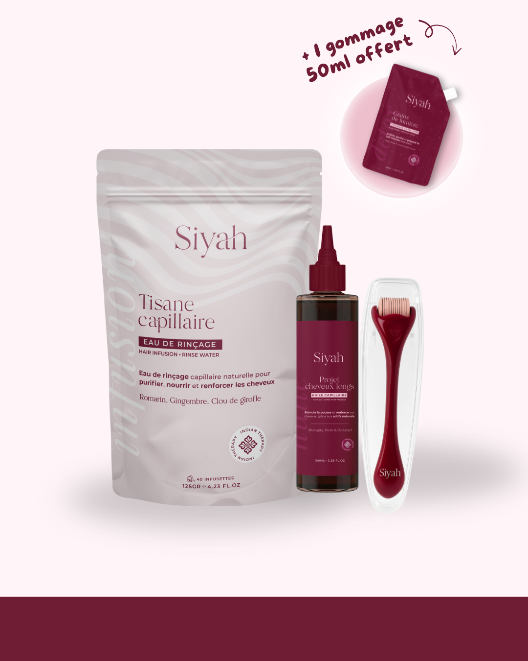 Le gommage (offert) libère le cuir chevelu des impuretés, l’huile nourrit en profondeur et fortifie la fibre, tandis que la tisane scelle l’hydratation et ravive l’éclat. Ce coffret transforme votre routine en véritable cure de stimulation capillaire.