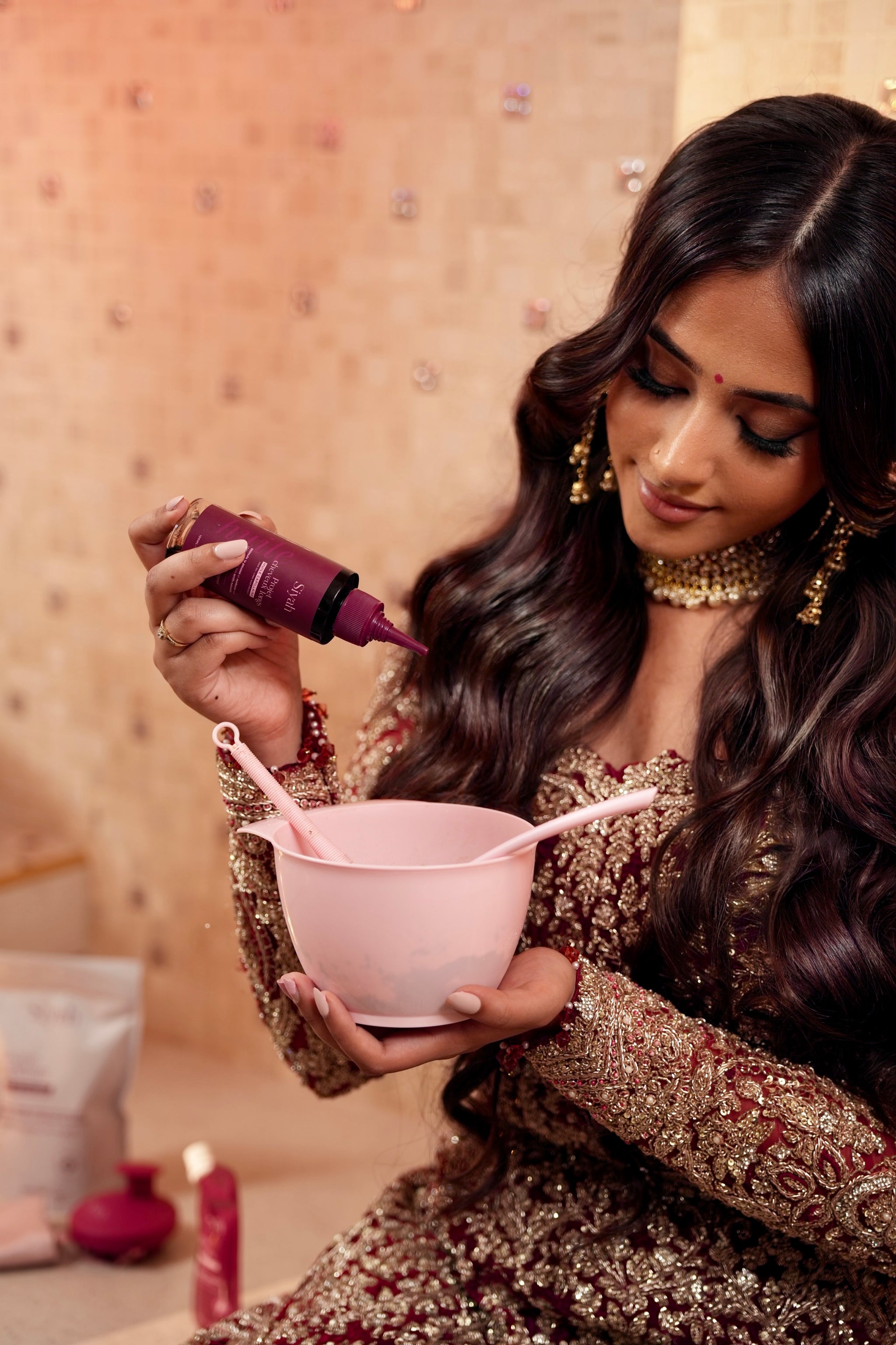On raconte qu'au coeur des palais indiens parfumés de jasmin, vivait une Reine à la chevelure si longue et éclatante qu'elle semblait capturer la lumière. Son secret : un rituel sacré mêlant poudres ayurvédiques, huiles précieuses et infusions parfumées, transmis de générations en générations.